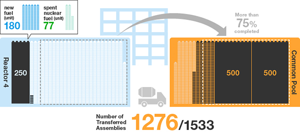 • Extracción de combustible de la piscina de la unidad 4. Desglose de conjuntos transferidos por tipo de combustible. Gastado 1254 conjuntos / 1331 conjuntos de combustible no irradiado (Nuevo) Número de tiempos de transporte barrica: 58 veces: TEPCO : Decommissioning Plan of Fukushima Daiichi Nuclear Power OTRAS NOTICIAS DE LA CENTRAL DE FUKUSHIMA: