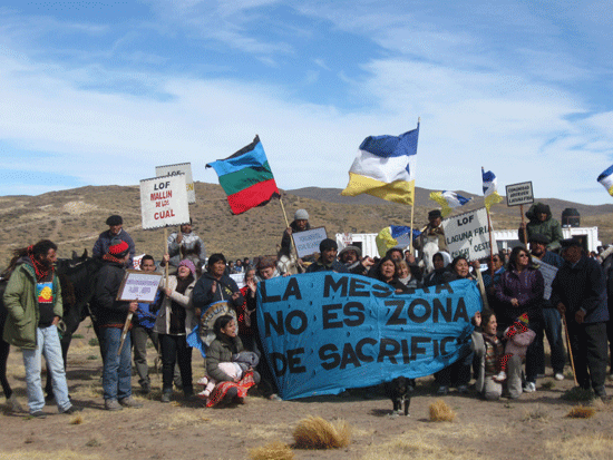 Los días previos a la cabalgata circularon todo tipo de versiones entre la población de Gan Gan que buscaban desmovilizar a los jinetes. Lo cierto es que en esta oportunidad nos aguardaba a la entrada del yacimiento una poco amistosa “comitiva” de bienvenida. Un centenar de personas uniformadas con las camperas mineras -entre empleados y gente pagada para la ocasión- esperaban detrás del alambrado que separaría a los manifestantes. Patrulleros, policías e infantería custodiaban a la minera. El organizado contra-acto de la corporación Pan American Silver parecía querer calcar el formato de las manifestaciones contra la megaminería. La música a todo volumen intentaba tapar las sentidas palabras que venían de los “lonkos” (jefes) y de pobladores que expresaban la lucha por el derecho a vivir en un ambiente sano, por la defensa de los territorios amenazados y la falta de agua recurrente que padecen. Pudimos constatar la división que producen las grandes mineras en las comunidades. Teníamos en nuestra memoria los ejemplos frescos del accionar cobarde de las transnacionales en Famatina, Andalgalá y en Esquel, pero aun así nos fue imposible disimular el dolor de saber que del otro lado del alambrado había hermanos, primos y tíos de quienes acompañábamos. Los pueblos empobrecidos son presa fácil para transformar la necesidad laboral en extorsión, y esta no era una excepción. Así todo el “newen” (la fuerza en Mapuche) nos acompañó y la dignidad de quienes no se venden “por dos pesos” fue mayor que el poder de la codicia que busca la división entre familias. “No pelearemos con nuestros hermanos”, decían. “Que vengan los directivos de la minera que acá no hay ninguno” El cierre de nuestra manifestación fue sorpresiva y movilizadora. Espontáneamente los jinetes dieron dos vueltas al galope pasando cerca del alambrado que separaba a los dos grupos. Para este humilde citadino que escribe, el grito tradicional Mapuche de los jinetes al galope sonó como un grito de guerra en la estepa Patagónica, un grito de dignidad y de valor que reafirma la lucha de las comunidades en el día internacional del agua.