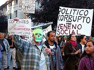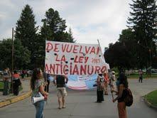 ”Hay gente de Bariloche, de Rawson y de Comodoro Rivadavia. Particularmente esta fecha es importante porque el 29 de diciembre pasado se cumplió un año de la derogación de la ley 3981, la Ley Anticianuro, que habíamos logrado promulgar en el año 2005, cuando gracias a la movilización de la gente comenzaron a aparecer los primeros cateos mineros en la provincia de Rio Negro. Y hace un año atrás, el 29 de diciembre, donde todos estábamos brindando, el Gobernador Carlos Soria derogó la ley. Desde entonces Río Negro ha vuelto a quedar sin protección. Hay miles de proyectos mineros en la provincia, eso es lo que nos preocupa y nos pone en la calle para decir que la megaminería no la queremos, que el destino de nuestros pueblos no es megaminería, no lo es y no lo va a ser, No a la megaminería, a la minería a gran escala que utiliza sustancias tóxicas.”
